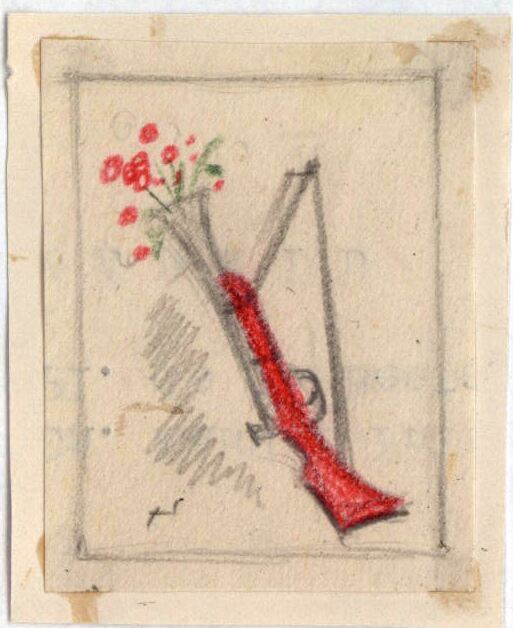 En este dibujo enmarcado y firmado por su autor se muestra la figura de una escopeta colgada en una pared con la posición de tiro hacia arriba de donde sale un ramo de flores silvestres. La escopeta es de color rojo y gris, por su parte de arriba. Una mancha grisácea configura su sombra.Boceto realizado para la ilustración de la revista semanal Novelas y Cuentos. Titulo El hijo de un ladron. Autor: Jules Mary. Nº publicado 1163. Fecha: 23-08-1953. Tomo NC.: 35