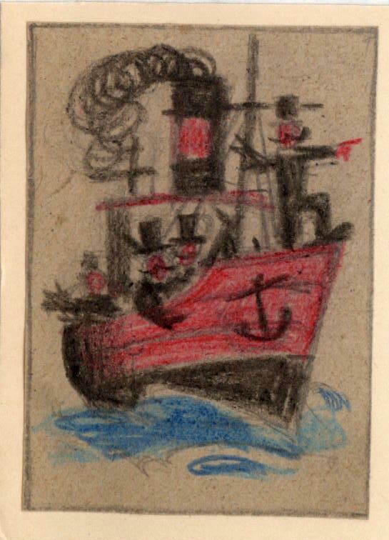 Navegando sobre las aguas azules del mar en este dibujo enmarcado se encuentra un barco de color rojo con una gran chimenea de la que sale un humo muy negro y una tripulación formada por hombres de tamaño pequeño, con traje negro, sombrero y espesos bigotes.Boceto realizado para la ilustración de la revista semanal Novelas y Cuentos. Titulo: Port-Tarascon. Autor: Alfonso Daudet. Nº publicado: 939. Fecha: 08-05-1949. Tomo NC.: 11.