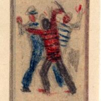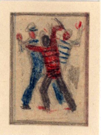 Aparecen en escena enmarcada tres hombres en actitud de lucha. En dos de ellos predominan los colores blancos y azules y en el tercero, situado de espaldas al observador, predominan los colores oscuros, negro y rojo.Boceto realizado para la ilustración de la revista Novelas y Cuentos. Titulo: El secreto del Buque Naufrago. Autor: R. L. Stevenson. Nº publc. 1057. Fecha: 12-08.1951 Tomo NC. 60. PI/. 475