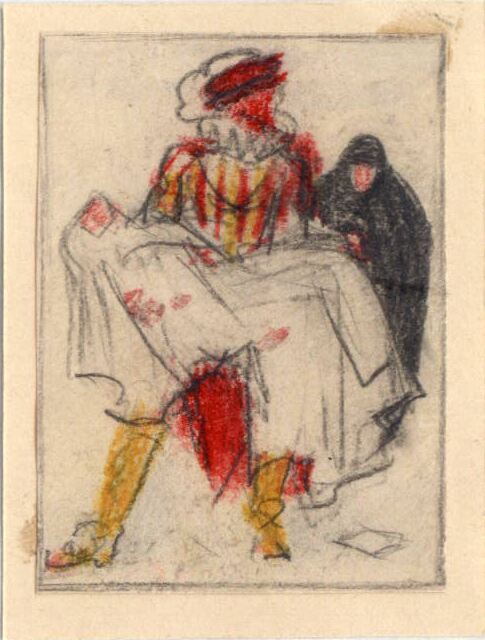 Tres figuras se representan en este dibujo enmarcado: en segundo plano un personaje femenino de negro y en primer término un caballero con sombrero y traje amarillento y rojizo que sostiene en sus brazos a una joven muerta con hábito blanco y ensangrentado. Todas las figuras se encuentran de frente.Boceto realizado para la ilusgtracion de la revista semanal Novelas y Cuentos. Titulo: Don Juan Tenorio. Autor: Jose Zorrilla. Nº publicado: 1015. Fecha: 22-10-1950. Tomo NC.: 35.