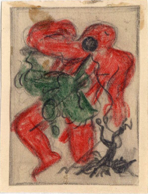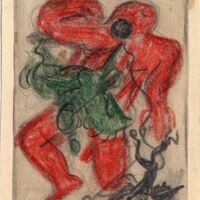 Una figura humana pero de género incalificable y de masa corpulenta se retuerce en la escena de este dibujo enmarcado. A la figura le acompañan formas sin definición posible de color verde, situada sobre la figura roja, y negra en la parte inferior e izquierda del dibujo y también sobre la forma humana roja.Boceto realizado para la ilustración de la revista semanal Novelas y Cuentos. Titulo: Autor: Nº publicado: Fecha: Tomo NC.: