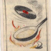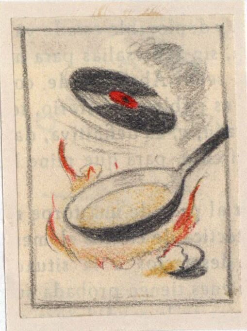Se vislumbra en este dibujo enmarcado una sartén que está “friendo” un disco, que ahora está en el aire como para empezar a hacer la otra cara. Bajo ella hay una pequeña hoguera y un huevo con la cáscara rota.Boceto realizado para la ilustración de la revista semanal Novelas y Cuentos. Titulo: El camino del amor. Autor: A. Lichtenberger. Nº publicado: 1198. Fecha: 25-04-1954. Tomo NC.: 56.