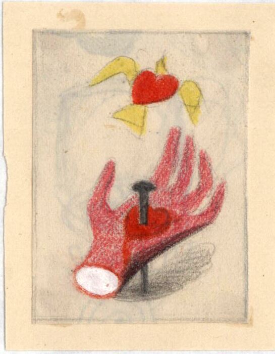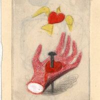 Sobre la palma de una mano rosa abierta hay un corazón rojo. Ambos están atravesados por un clavo. Por encima de la mano emprende el vuelo una paloma amarilla con un corazón rojo. El dibujo está enmarcado con líneas suaves.Boceto realizado para la ilustración de la revista semanal Novelas y cuentos. Titulo: En vano. Autor: Enrique Sienkiewicz. Nº publi8cado: 1103. Fecha: 29-06-1952. Tomo NC.: 42.