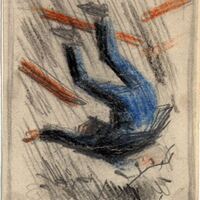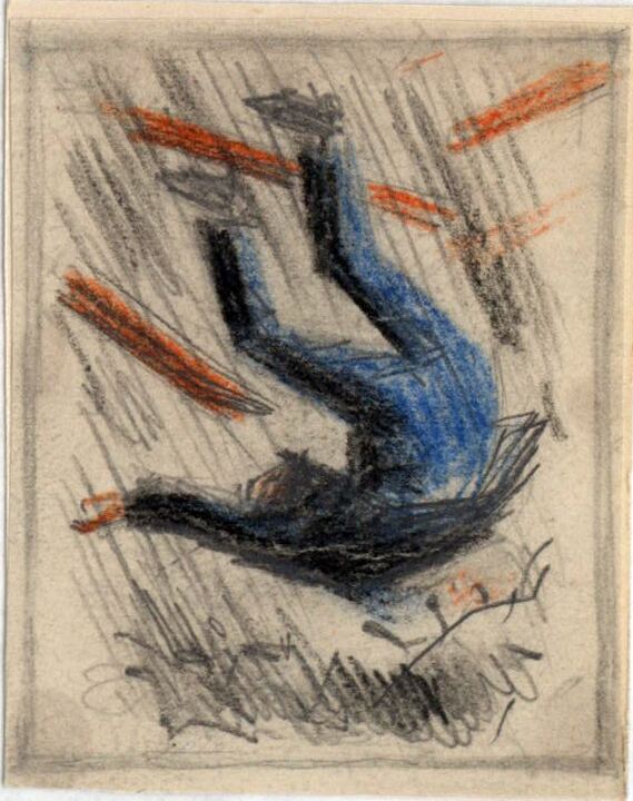 En un ambiente de gran tempestad creada en el dibujo por medio de manchas negras que parecen lluvia y grandes nubarrones vuelan, acaso por el efecto del viento, pedazos de madera y el cuerpo de un hombre con traje azul oscuro. El dibujo está enmarcado con líneas muy suaves a lápiz.Boceto realizado para la ilustración de la revista semanal Novelas y Cuentos. Titulo: El puente del deseo. Autor: Warwick Deerring. Nº publicado: 1256. Fecha: 05-06-1955. Tomo NC. 43.
