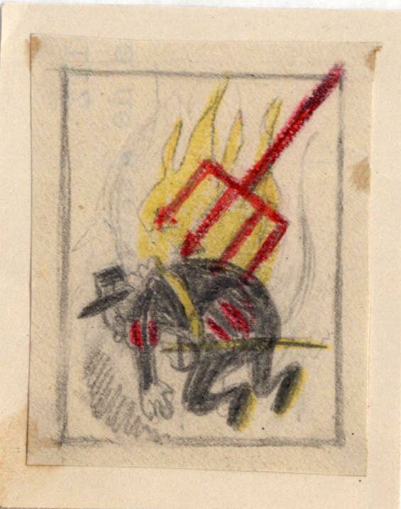 Un gran tridente rojo envuelto en llamas surge en este dibujo enmarcado espetando a un hombre por su espalda. El cuerpo del hombre parece inerte y se destaca en su persona un sombrero y un traje oscuro con algún adorno rojo y amarillo. Manchas oscuras crean sombras y humo.Boceto realizado para la ilustración de la revista semanal novelas y cuentos. Titulo: El Alcalde Ronquillo. Autor: Jose Zorrilla. Nº publicado: 1162. Fecha: 11-08-1953. Tomo NC.: 40.
