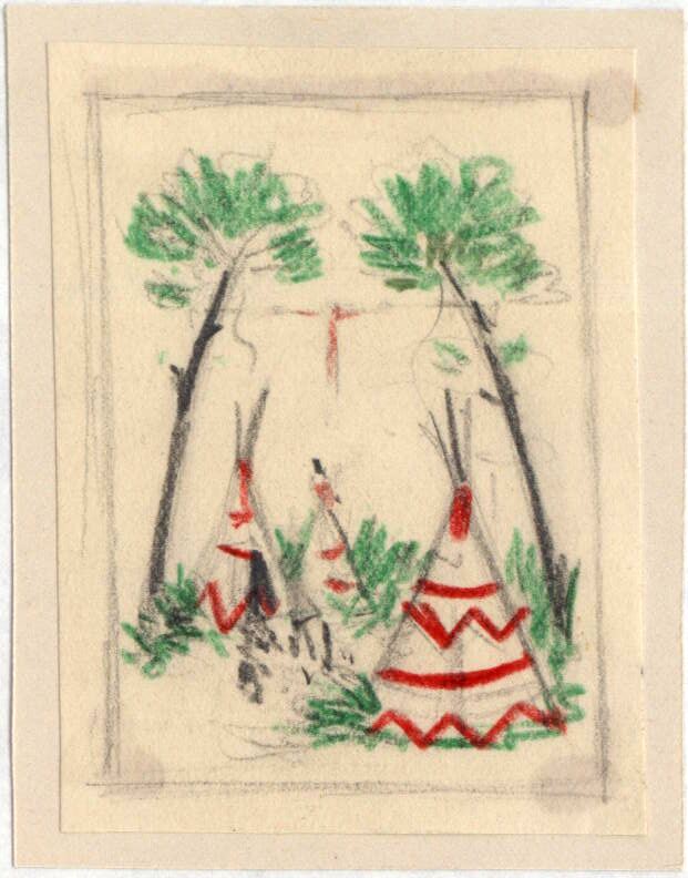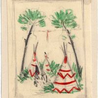 En esta escena campestre destacan, entre dos largos árboles y matorrales, la figura de tres tiendas indias, cuya forma es piramidal, de color blanco y con adornos rojos. La imagen de la escena está ligeramente enmarcada por líneas suaves. Entre los dos arboles se encuentra una persona amarrada por las manos quedando en posición de cruz.Boceto realizado para la ilustración de la revista semanal Novelas y Cuentos. Titulo: El cazador de abejas. Autor: Femimore Cooper. Nº publicado: 1132. Fecha: 18-01-1953. Tomo NC.: 59