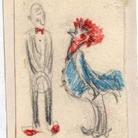 A la derecha del dibujo enmarcado destaca la figura estilizada de un hombre con traje oscuro, pajarita y zapatos rojos que observa a otro hombre con forma de gallina, a la izquierda, llevando una chaqueta azul y un pantalón blanco. En su cabeza destaca una cresta y cuello colgante rojos.Boceto realizado para la ilustración de la revista semanal Novelas y Cuentos. Titulo: Una historia de locos. Autor: Edgar A. Poe. Nº publicado: 1246. Fecha: 27-03-1955. Tomo NC.: 46.