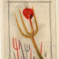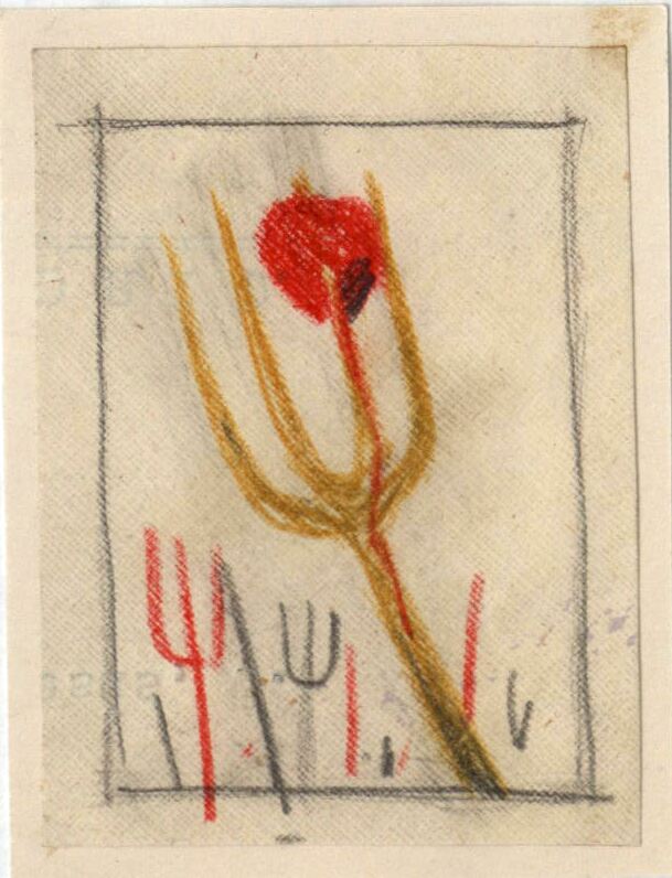 Varios rastrillos de diferentes tamaños configuran el dibujo. Dibujo insertado en un enmarque. El rastrillo más grande es amarillo y en uno de sus púas tiene un corazón del que brota sangre. Los demás rastrillos, rojos y negros.Boceto realizado para la ilustración de la revista Novelas y Cuentos. Titulo: La Señora de Neuville. Autor: Madame Bourdon . Nº publc. 1177. Fecha: 29-11-1953. Tomo NC 53. PI/. 423.