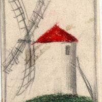 - Sobre un monte verde se levanta un molino de paredes blancas y tejado rojo con grandes hélices. El dibujo se encuentra enmarcado.Boceto realizado para la ilustración de la revista semanal Novelas y Cuentos. Titulo: Castas de mi molino. Autor: Alfonso Daudet. Nº publicado: 1259. Fecha: 26-06-1955. Tomo NC.: 46.
