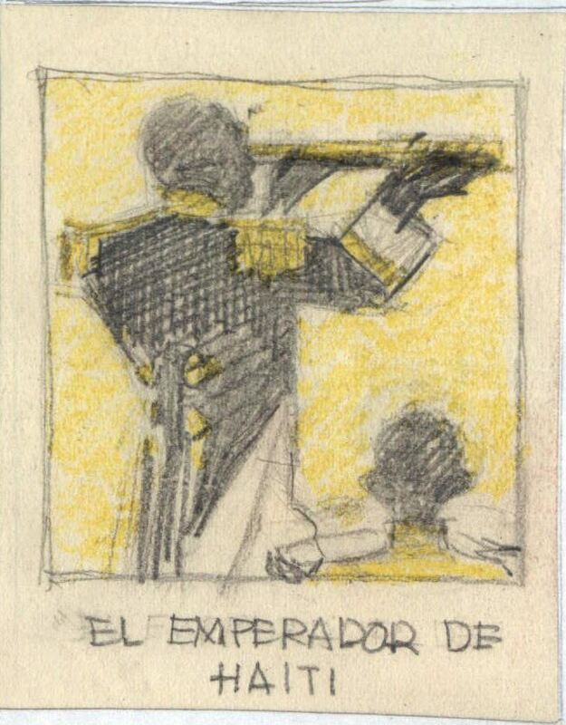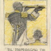 - En el dibujo enmarcado sobre un fondo amarillo se representa a un hombre con su traje militar de chaqueta azul y pantalón blanco mirando por un catalejo. En el mismo dibujo se ve la cabeza de espalda de otro hombre.Boceto realizado para la ilustración de la revista semanal Novelas y Cuentos. Titulo: Autor: Nº publicado: Fechas: Tomo NC.: