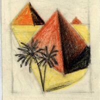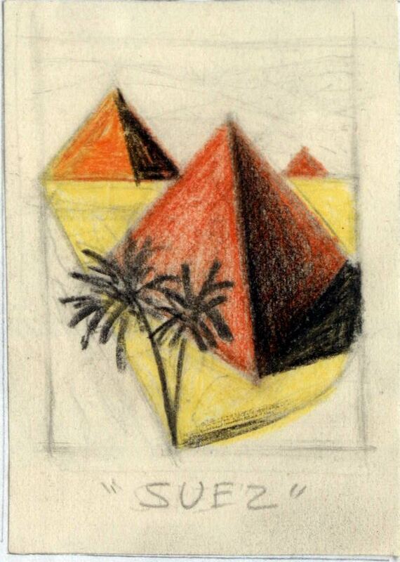 - En este dibujo enmarcado suavemente con el título de “suez” se representan las vistas de un desierto de arenas amarillas, pirámides rojas y grandes palmeras.Boceto realizado para la ilustración de la revista semanal Novelas y cuentos. Titulo: Autor: Nº de orden: Fecha: Tomo NC.:
