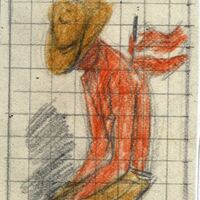 En el dibujo cuadriculado y enmarcado se representa la figura de un chico joven con camisa naranja, pantalón amarillo y con sombrero también amarillo agachando ligeramente la espalda sobre la que unas manos realizan una operación. Una mancha negra deja adivinar la sombra que refleja la figura.Boceto realizado para la ilustración de la revista semanal Novelas y Cuentos. Titulo: Autor: Nº publicado: Fecha: Tomo NC.: