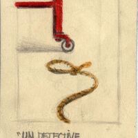 En este dibujo enmarcado cuyo título es “un detective espectacular” se ve una cuerda amarilla con forma serpenteante y la pata roja de un carrito.Boceto reslizado para la ilustración de la revista semanal Novelas y Cuentos. Titulo: Un detective espectacular. Autor: H. C. Bailey. Nº publicado: 1320. Fecha: 26-08-1956. Tomo NC.: 48.