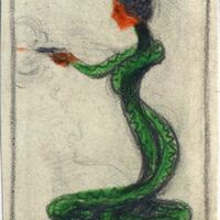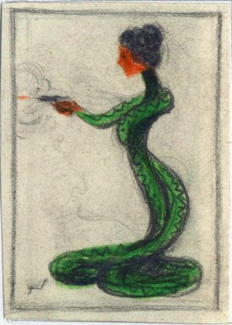 Una mujer serpiente con el cuerpo de reptil verde enrollado en su extremidad y cabeza humana coge en sus manos una pistola que dispara. La figura se halla de perfil y enmarcada en este dibujo donde también se destaca el boceto de la firma del pintor.Boceto realizado para la ilustración de la revista semanal Novelas y Cuentos. Titilo: trágica herencia. Autor: A. du Maurier. Nº publicado: 1312. Fecha: 07-07-1956. Tomo NC.: 57.