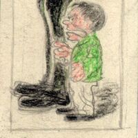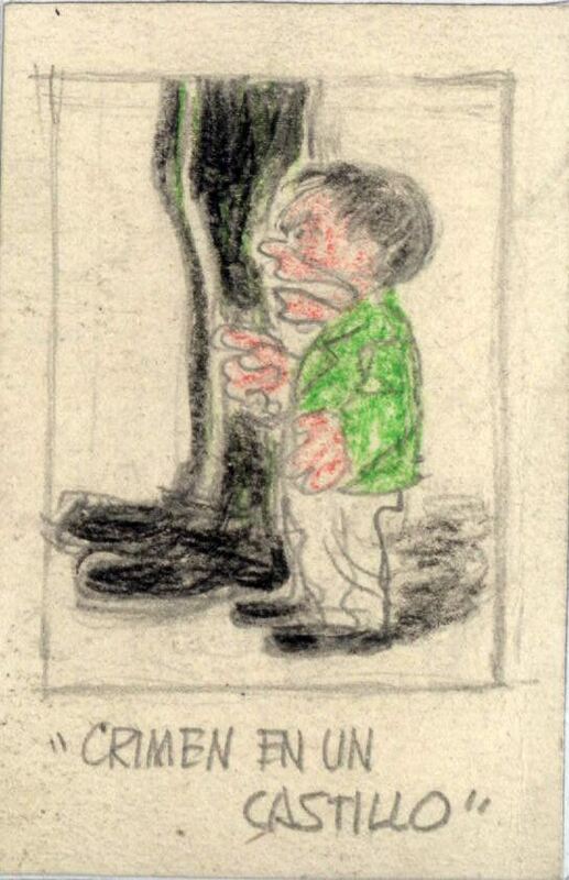 En este dibujo enmarcado se ve una figura de un hombre diminuto con la boca abierta, señalando con las manos, con pantalón blanco y camiseta verde al lado de unas piernas con pantalón negro y muy altas. Ambas figuras se encuentran de perfil.Boceto Realizado para la ilustración de la revista semanal Novelas y Cuentos. Titulo: Crimen en un castillo. Autor: S. A. Stecman. Nº publicado: 1250. Fecha: 24-04-1955. Tomo NC.: 29