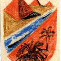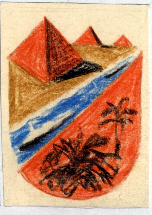En un escudo dividido en tres franjas se representa: en la parte superior un paisaje con arenas amarillas y tres pirámides rojas. En la parte central navega un barco sobre aguas azules y en la última franja con el fondo rojo se han dibujado unas palmaras negras.Boceto realizado para la ilustración de la revista semanal Novelas y cuentos. Titulo: Autor: Nº publicado: Fecha: Tomo NC.: