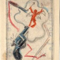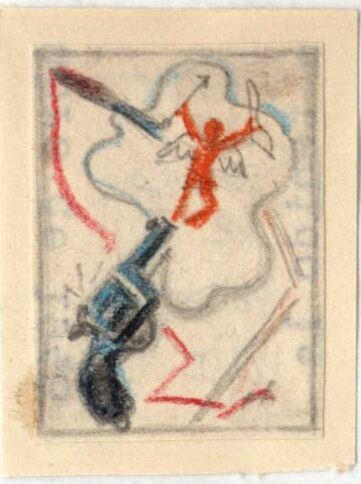 En dicha imagen enmarcada aparecen varias figuras: una pistola a la derecha en posición vertical y de color negro dispara la figura de un hombrecillo, armado con arco y flecha, de color rojo y con alas blancas, rodeado por una nube contorneada a lápiz, cuyo fondo es blanco. La tercera figura parece un cuchillo en tonos castaños, del que se desprende una cinta roja, situado en el margen derecho superior.Boceto realizado para la ilustración de la revista Novelas y Cuentos. Titulo: La sombra de Peter Wald. Autor: Alberto Insua. Nº public. 1045. Fecha: 20-05-1951. Tomo NC: 60. PI/. 527