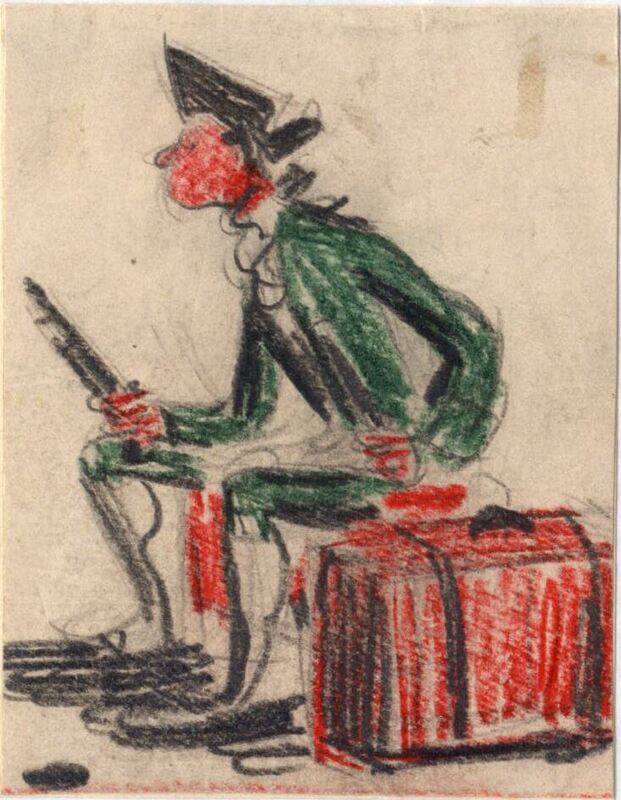 En una posición ladeada o de perfil está situado un soldado del siglo XIX de traje verde con su fusil y sobre su cabeza lleva un sombrero de color negro. A su lado, una maleta roja.Boceto realizado para la ilusgtración de la revista Novelas y Cuentos. Titulo: Los herederos del Comendador. Autor: Poson Du Terrail. Nº public.: 861. Fecha: 09-11-1949. Tomo NC. 19. PI/. 309