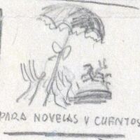 - “Para novelas y cuentos” se ha realizado una imagen en la que se representa una sombrilla con un lazo, abierta y sujeta por unas manos femeninas. En un segundo plano se aprecia una figura a caballo. Destaca el color blanco grisáceo. Líneas abocetadas intentan enmarcar el dibujo.Bocetos realizados para Novelas y Cuentos.