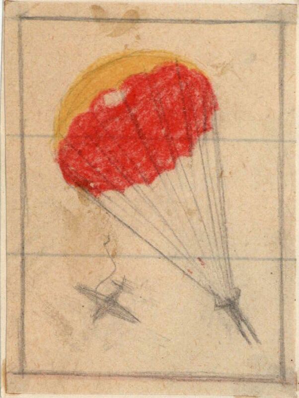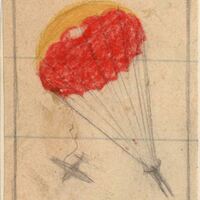 La figura central es un paracaidista tratado de forma estilizada y color negro que inicia su caída ayudado por su paracaídas rojo y amarillo. A lo lejos se vislumbra el avión de donde ha caído el hombre. El dibujo está enmarcado.Boceto realizado para la ilustración de la revista Novelas y Cuentos. Titulo: Verano Extraordinario. Autor: Philip Gibbs. Nº. public.: 1142. Fecha: 29-03-1953. Tomo NC.:47