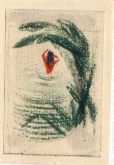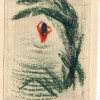Una figura femenina, de la que sólo se aprecia el tronco, de cabello negro y cuerpo rojo se encuentra rodeada de una atmósfera en tonos verdosos, mientras se adentra en lo que parece un lago. Una gran hoja verde oscura ocupa toda la parte de la derecha del dibujo que se halla ligeramente enmarcado.Boceto realizado para ilustración de la revista Novelas y Cuentos Titulo: Un amor en los mares del Sur Autor: S. W. Powell Nº publicación: 1.072; Fecha: 25-11-1951; Tomo NC/ 60 Prueba de Imprenta: 146