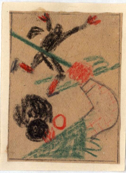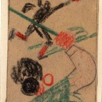 En esta escena enmarcada se representa la imagen de una mujer de espalda de la que solamente se ve su cabellera negra recogida en un moño y su traje del que sobresale una manga blanca y un chal verde. En su mano parece llevar un palo y un gran pendiente le adorna una de las orejas. En segundo plano se aprecia la figura de un hombre con traje oscuro que corre despavorido ante las amenazas de la mujer.