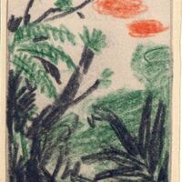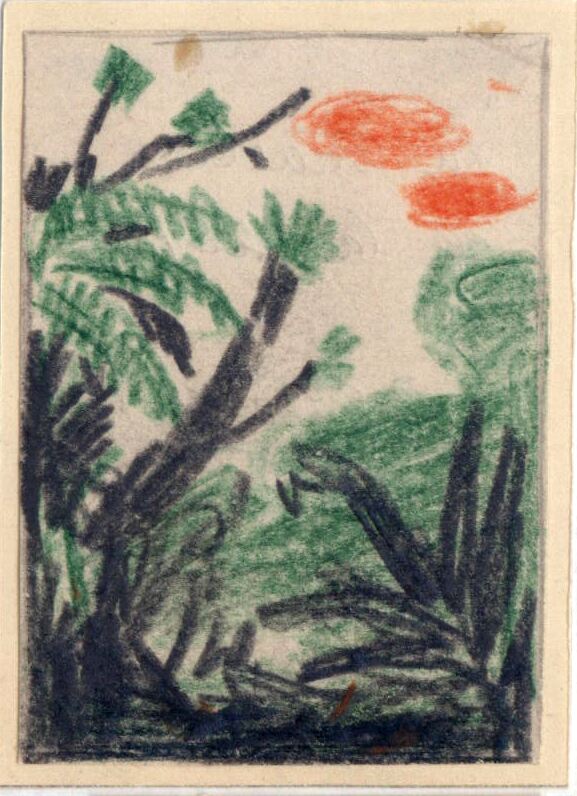 Se aprecia en la imagen un bosque de árboles cuyas copas son verdes y sus troncos negros. En el cielo se dejan ver dos nubes en tonos prácticamente rojos. El dibujo es muy esquemático e intencionadamente infantil.Boceto realizado para la ilustración de la revista Novelas y Cuentos: Titulo: La Atracción de la Selva Autor: Andrés Amandy Nº publicación: 840; Fecha: 15-06-1947; Tomo NC/. 17 Prueba de Imprenta: 380