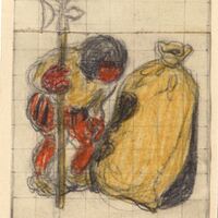 Sobre fondo cuadriculado se observa la figura de un soldado agachado mirando detenídamente un saco amarillo de grandes dimensiones, situado a la izquierda del dibujo. El soldado lleva en su mano derecha una lanza y su vestimenta se compone de unas calzas a rayas negras y rojas y un corpiño amarillo, medias rojas y zapatos amarillos.Boceto realizado para la ilustración de la revista semanal Novelas y Cuentos. Titulo: Bertoldo, Bertoldino y Cacaseno. Autor: J. C. de la Cruce. Nº public.: 947. Fecha: 03-07-1949. Tomo NC.: 16. PI/. 311-