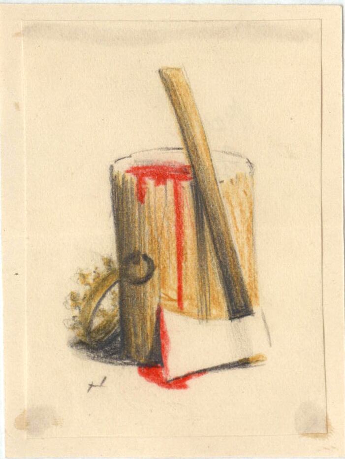 Sobre un cubo amarillento del que salen manchas rojas pareciendo sangre se apoya el hacha de la ejecución real, manchada igualmente de rojo. En este caso se puede apreciar el posible boceto de la firma del artista.Boceto realizado para la ilustración de la revista semanal Novelas y Cuentos. Titulo: María Estuardo. Autor: Federico Shiller. Nº public.: 1099. Fecha: 01-06-1952. Tomo NC.: 39. PI/. 183.