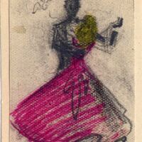 Una pareja de bailarines aparece en primer término. El hombre va vestido con un traje en negro y blanco mientras que la bailarina, una joven rubia, lleva un vestido largo de color fucsia. Una escena en la que se aprecia el movimiento de la danza. El dibujo se encuentra enmarcado.Boceto realizado para la ilustración de la revista Novelas y Cuentos: Titulo: Autor: Nº publicado: Fecha Tomo NC/. No; Prueba de Imprenta 446