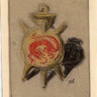Fantasía de un objeto propio de ambientes rurales representado en este dibujo. Es de color amarillo, con tres patas cortas y tres brazos también cortos. En el centro tiene dibujada la imagen de un reptil. La imagen forma una gran sombra de color negro. Acompañando al objeto el posible boceto de la firma del autor.Boceto realizado para la ilustración de la revista semanal Novelas y Cuentos. Titulo: El jarron Amarillo. Autor: John P. Marquand.Nº public.: 938. Fecha: 01-05-1949. Tomo NC.: 20. PI/. 348.