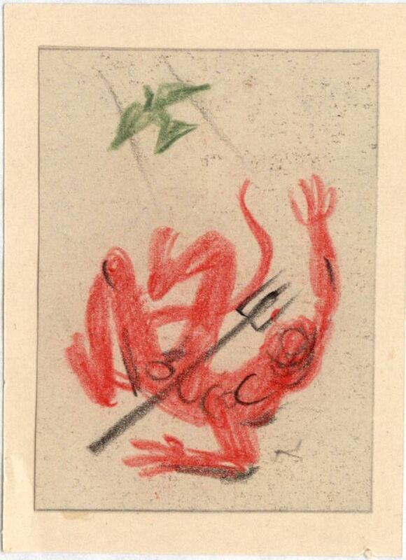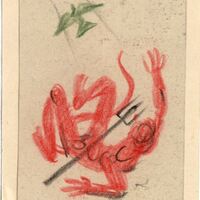 Representado en esta imagen un diablo rojo cae del cielo con su tridente. En la parte superior aparece una paloma de color verde. Todo el dibujo enmarcado está sobre un fondo claro. Bosquejo de la firma en la parte inferior derecho.Boceto realizado para la ilustración de la revista semanal Novelas y Cuentos. Titulo: Arrepentimiento. Autor: George Eliot. Nº publicado: 958. Fecha: 13-09-1949 Tomo NC. 17. PI/. 297.