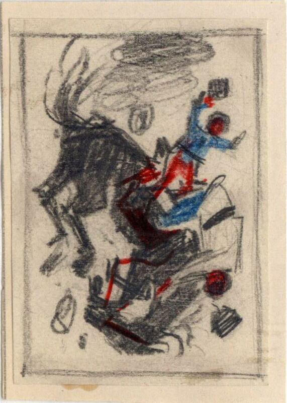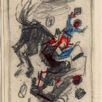 Enmarcada se vislumbra la escena ecuestre un tanto violenta en la que un caballo se agita haciendo que dos jinetes pueden caer en cualquier momento. El caballo es negro y los jinetes lleva un traje de color azul con calzas rojas, el otro parece un cosaco con camisa blanca y calzas azules, se vislumbra que a este jinete se le desprende un gorro negro. El movimiento es apreciable en toda la composición.Boceto realizado para la ilustración de la revista semanal Novelas y Cuentos. Titulo: Terrible Venganza. Autor: Nicolás Gogel. Nº public.: 1180.Fecha: 20-12-1953 Tomo NC.: 58. PI/. 247