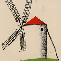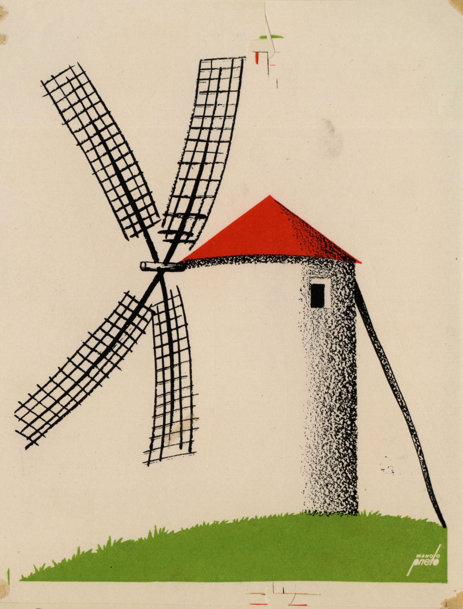 En este dibujo firmado destaca, sobre un campo de hierba verde, un gran molino de viento con sus paredes blancas, el tejado rojo y una única ventana en lo alto muy pequeña.Prueba de imprenta. Ilustración realizada para la revista semanal de Novelas y Cuentos. Titulo: Cartas de mi molino. Autor: Alfonso Daudet. Nº publicado: 1259. Fecha: 26-06- 1955. Tomo NC. 46.