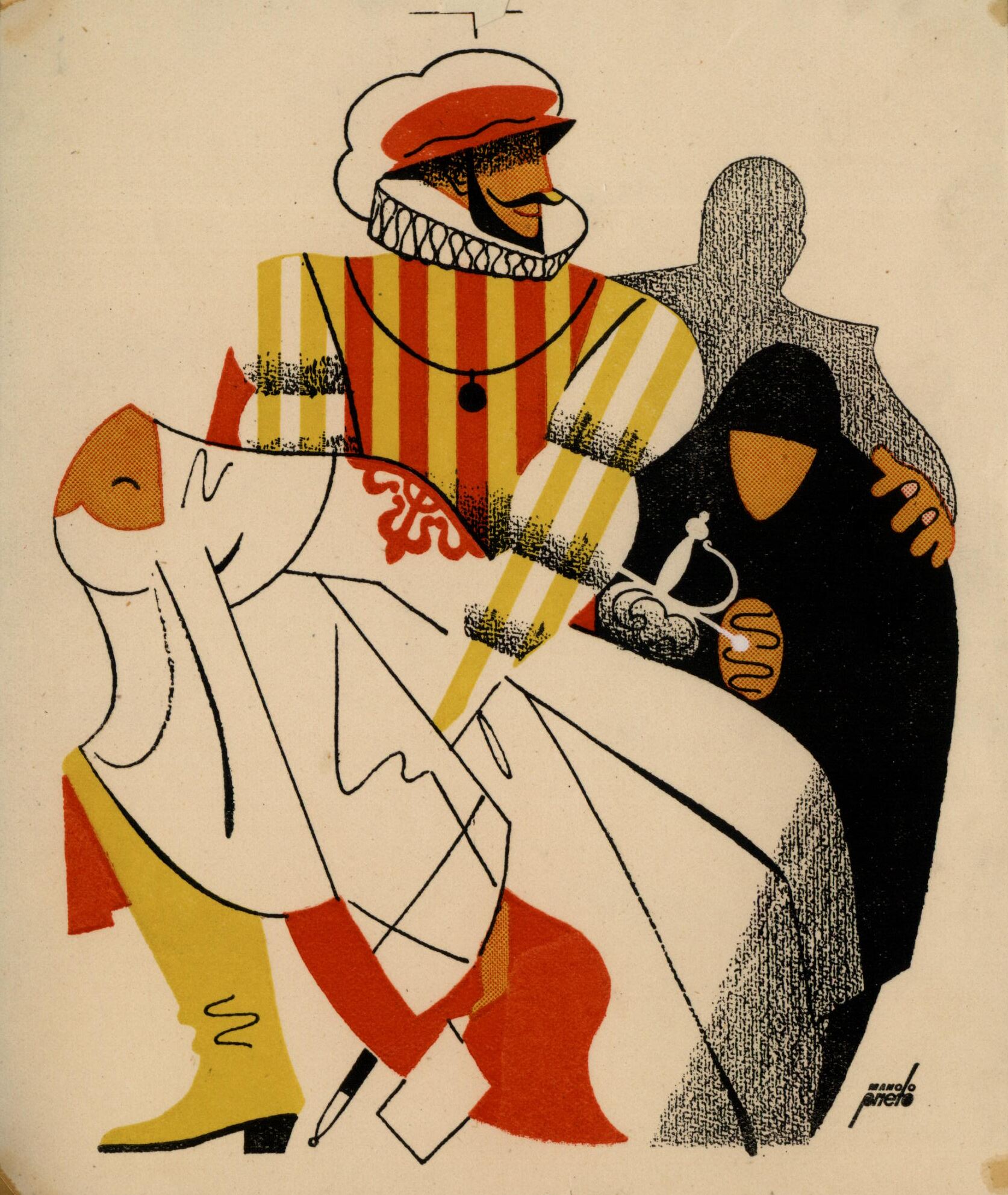 Un caballero, en el que destaca un traje de gran riqueza, de color amarillo con rayas rojas, una gola blanca y un sombrero rojo con penacho blanco, sostiene en sus brazos a una figura femenina desmayada con un hábito blanco y con un adorno rojo sobre su pecho. En un segundo plano se ve la imagen de una mujer de negro y encorvada. En el dibujo está presente la firma del pintor.Prueba de imprenta. Ilustración realizada para la revista semanal Novelas y Cuentos. Titulo: Don Juan Tenorio. Autor: José Zorrilla. Nº publicado: 1015. Fecha: 22-10-1950. Tomo NC. 35.