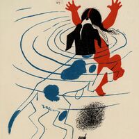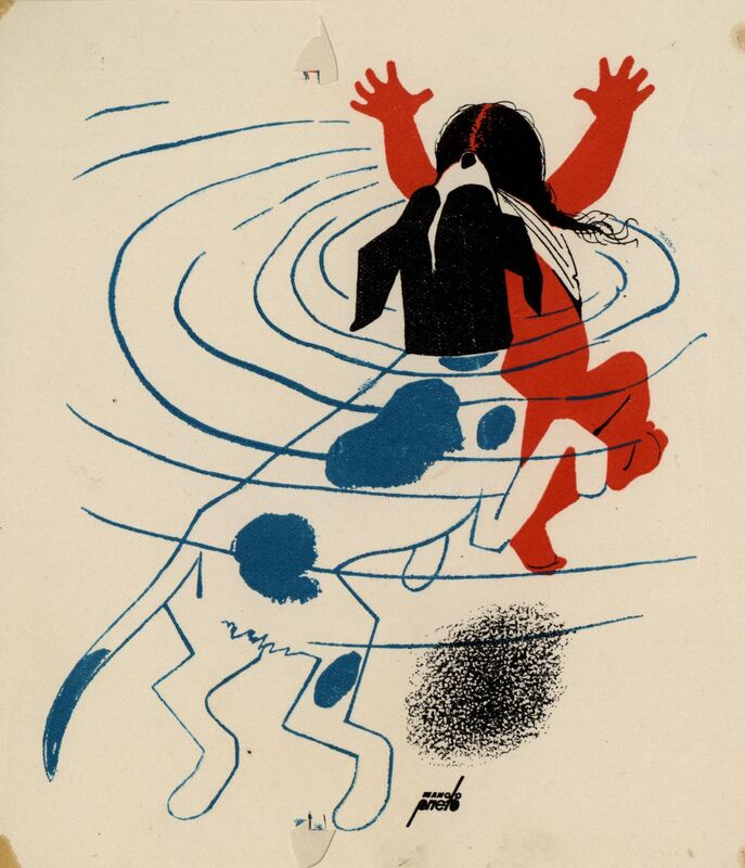 En este dibujo firmado un perro blanco con algunas manchas azules salva a una niña de morir ahogada en las aguas azules de algún río. La niña está desnuda y su pelo suelto es negro.Prueba de imprenta. Ilustración realizada para la revista semanal de Novelas y Cuentos. Titulo: El perro Robinson y su amo; R.M.Ballantyne Autor: Nº publicado: 1172 Fecha: 25-10-53 Tomo NC.33