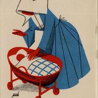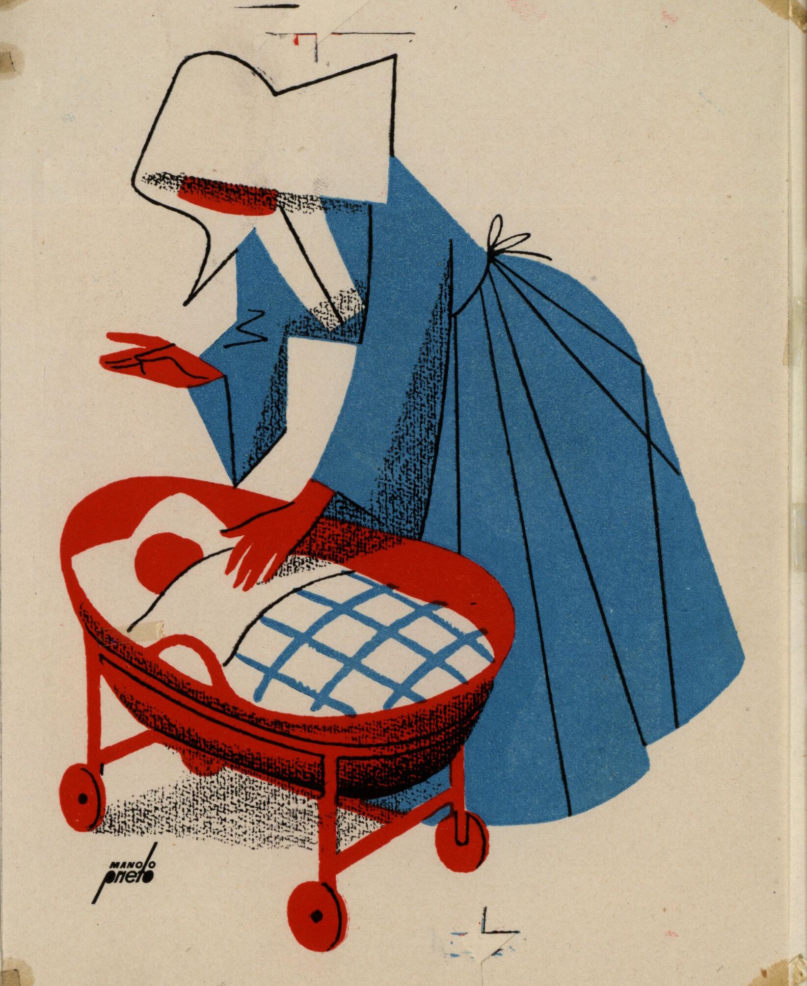 Una niñera con un vestido azul y con una toca blanca sobre su cabeza acuna a un bebé que se encuentra en una cuna pequeña de color rojo y con la manta blanca a cuadrados azules. La firma del pintor está presente como se puede ver bajo el dibujo de la cuna en el lado derecho de la composición.Prueba de imprenta. Ilustración realizada para la revista semanal Novelas y Cuentos. Titulo: Canción de cuna. Autor: Gregorio Martínez Sierra. Nº publicado: 1324. Fecha: 23-09-1956. Tomo NC. 43.