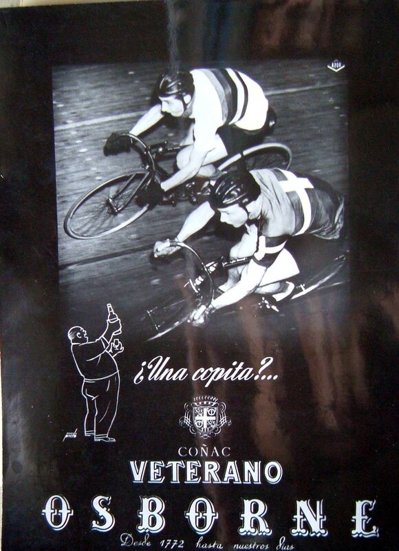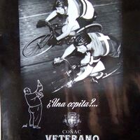 - Cartel compuesto sobre un fondo negro con la fotografía de dos ciclista en carrera, debajo la silueta en blanco de un hombre de perfil ofreciéndoles una copita, seguido de los rótulos y leyendas correspondientes a la publicidad del coñac Veterano Osborne.