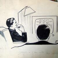 - Con un juego de trazos negros sobre fondo blanco se representa la escena de dos hombres de espaldas, vestido de etiqueta sentados frente a la televisión, mientras beben de sus copas, con unas anotaciones a lápiz donde se puede leer “urgente.”
