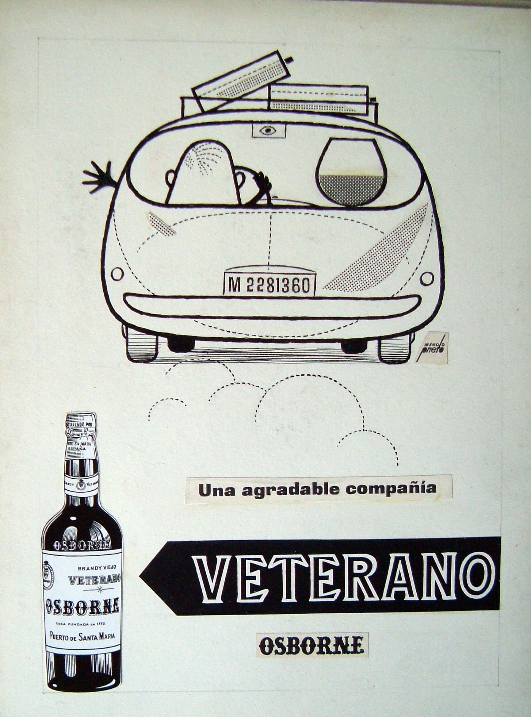 - Dibujo con la silueta de un coche con maletas encima de la baca y el piloto de espaldas saludando con su mano y al lado como copiloto una copa, debajo un cartel cuya dirección apunta a una botella de veterano Osborne.