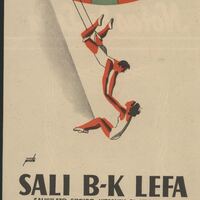 - Cartel anunciando una marca contra el reumatismo y el mal de huesos, con la imagen de una carpa y de dos trapecista en el aire, el hombre sobre un columpio agarra a una mujer en pleno vuelo, debajo de ellos la leyenda correspondiente al spot publicitario.
