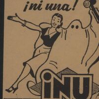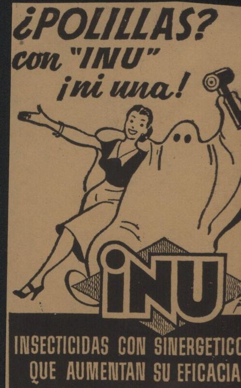 - Cartel publicitario de un insecticida contra polillas, con la imagen de una mujer contenta bailando junto a la figura de un fantasma con un martillo en su mano, en el rótulo superior se puede leer “Polillas, con Inu ni una.”