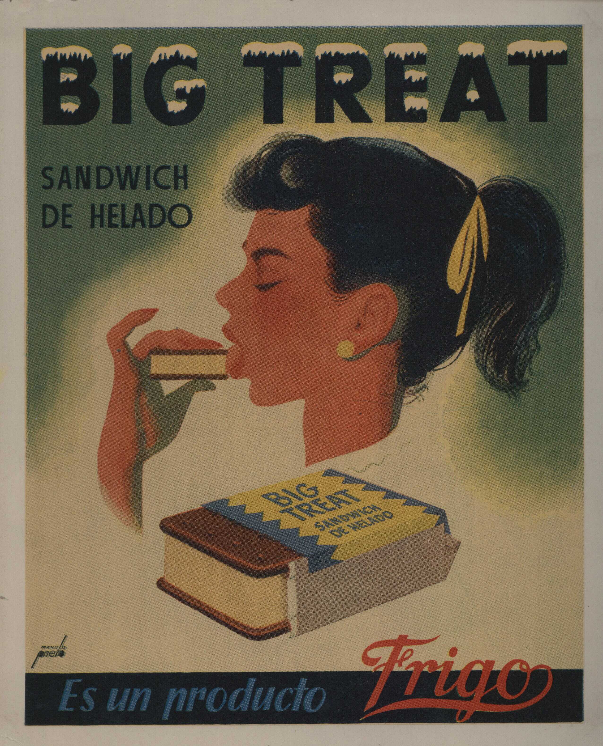 - Impresión sobre el papel de una revista, con el cartel publicitario de una marca de helados Frigo, con la imagen de una joven de perfil con el pelo recogido en una coleta, comiéndose el helado.