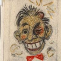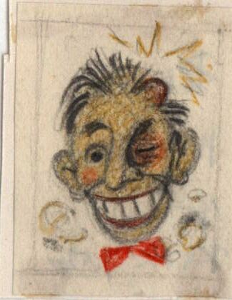 La imagen de una gran cara con orejas pronunciadas, con una boca enorme mostrando sus dientes muy blancos, con algunos pelillos oscuros, un ojo abierto y otro cerrado, además de un gran chichón en la cabeza es lo representado en este dibujo. La cara tiene un color amarillento y de su barbilla sobresale una pajarita roja.Boceto realizado para la ilustración de la revista semanal Novelas y Cuentos. Titulo: Blanca por fuera rosa por dentro. Ajutor: E. Jardiel Poncela. Nº publicado: 1211 Fecha: 25-07-1954. Tomo NC. 53. PI/. 236.