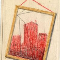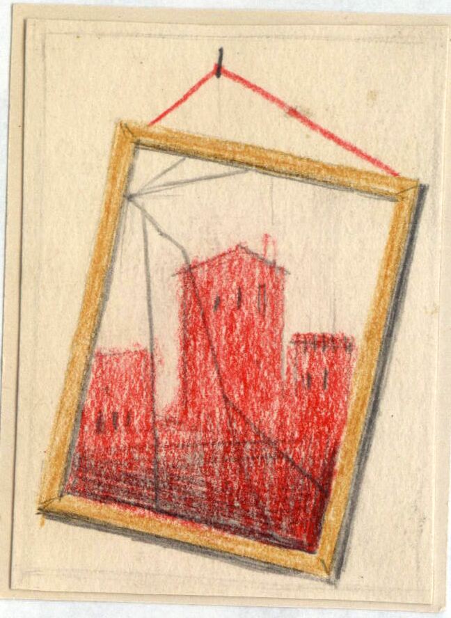 Un cuadro en muy mal estado con el cristal roto, es lo que se puede apreciar. Sujeto mediante cintas de color rojo mediante un clavo muy sobresaliente aparece medio torcido. En él se representan tres torres de color rojo con ventanas diminutas en negro. El marco es amarillo.Boceto realizado para la ilustración de la revista semanal Novelas y Cuentos. Titulo: El frágil espejo. Autor: Norat Lofts. Nº public.: 1271. Fecha: 18-09-1955. Tomo NC.: 37. PI/. 204.