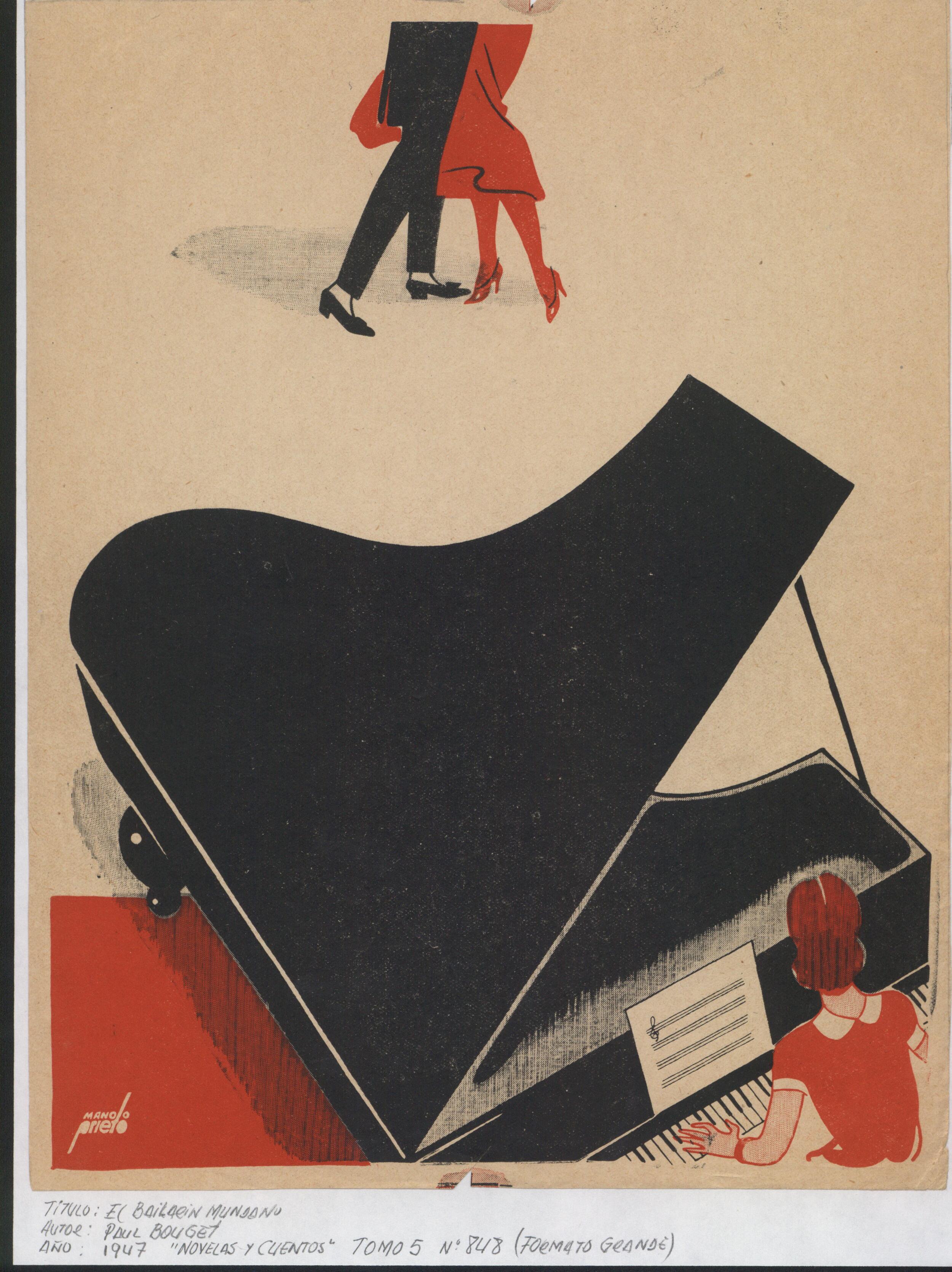 En el dibujo, firmado y enmarcado por la parte inferior, se puede ver un piano de cola negro y con la tapa abierta mientras una mujer interpreta una música. En segundo plano se vislumbra una pareja, de la que solamente se ven sus extremidades inferiores, bailando. Ella va de rojo y él de traje negro.Prueba de Imprenta, ilustración realizada para la revista semanal Novelas y Cuentos. Titulo: El bailarin mundano. Autor: Paul Bouget. Nº publicado: 848. Fecha: 10-08-1947. Tomo NC.: 5.