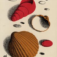 Sobre un fondo claro en esta composición, en la que se puede ver la firma del artista, se han representado tres conchas de mar, una roja y alargada y las otras marrones. A su alrededor se ven algunas piedras blancas y rojas.Prueba de imprenta. Ilustración realizada para la revista semanal Novelas y Cuentos. Titulo: Las conchas purpúreas. Autor: R. L. Goldan. Nº publicado: 1153. Fecha: 14-06 -1953. Tomo NC.: 43.