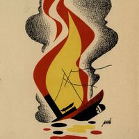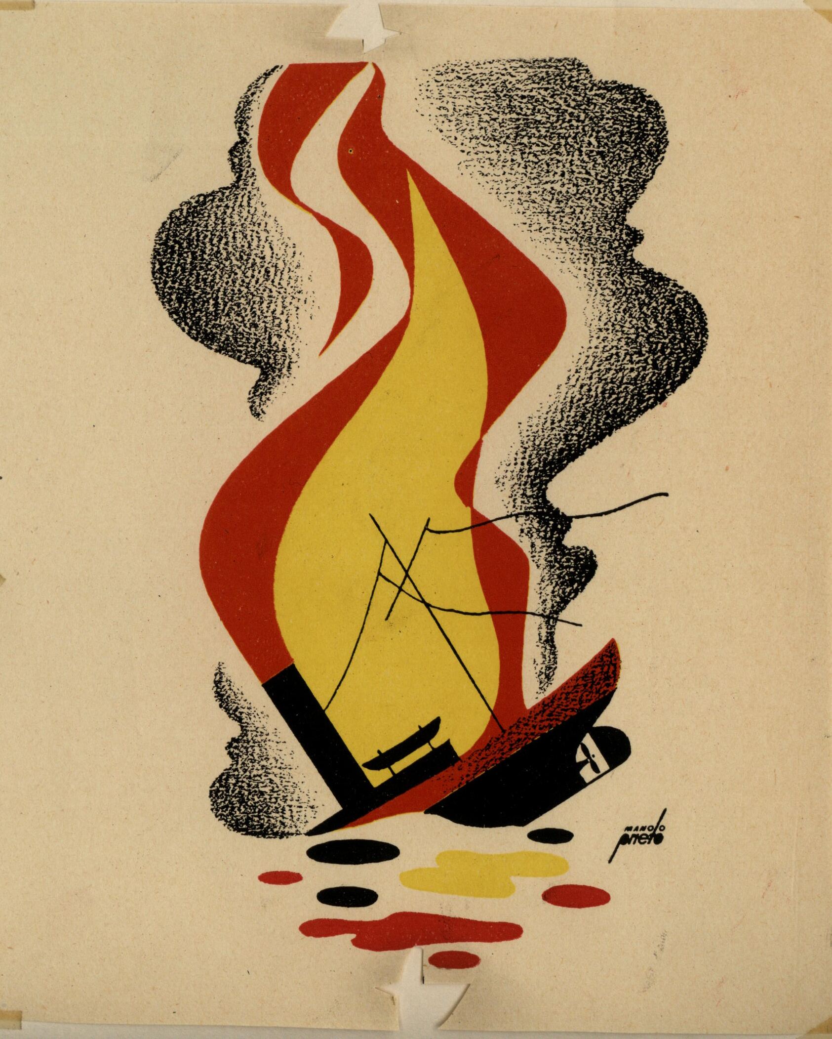 En este dibujo firmado se representa el hundimiento de un barco negro con grandes chimeneas envuelto en una atmósfera de grandes llamas en la que destacan los colores amarillo, rojo y negro.Prueba de imprenta. Ilustración realizada para la revista semanal Novelas y Cuentos. Titulo: La voluntad de Dios. Autor: A. Hernández Cata. Nº publicado: 1051. Fecha: 01-07-1951. Tomo NC.: 46