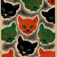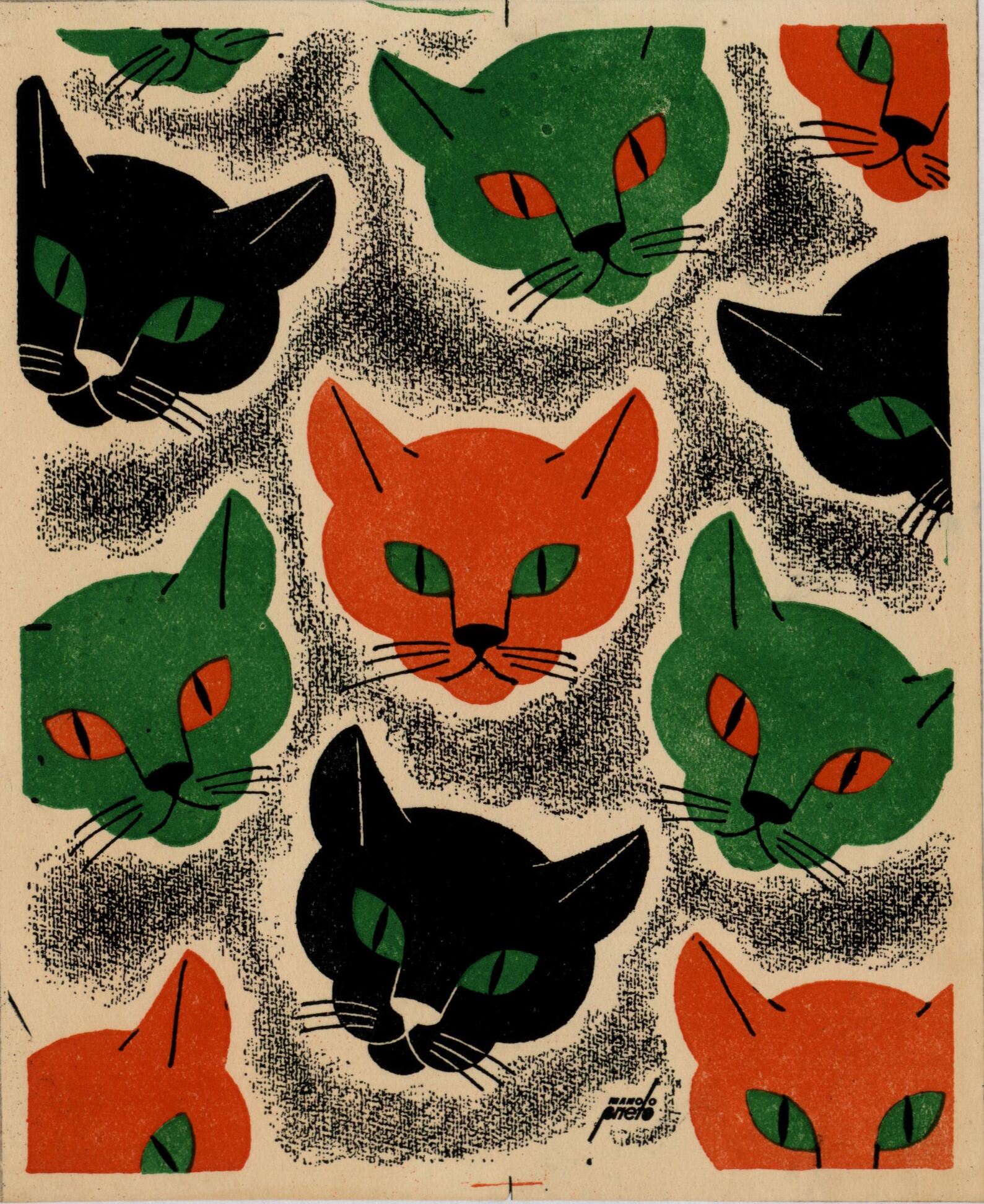 - En este dibujo enmarcado y firmado destacan numerosas caras de gatos de varios colores como el verde, rojo y negro. Entre las caras destaca el color negro.Prueba de imprenta. Ilustración realizada para la revista semanal Novelas y Cuentos. Titulo: Autor: Nº publicado: Fecha: Tomo NC.:
