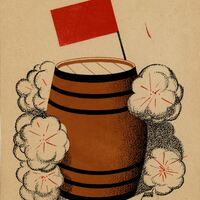 - La imagen de un barril marrón y en posición vertical con una bandera roja en la parte superior y a su alrededor manchas blancas es el centro de esta composición firmada por el artista.Prueba de imprenta. Ilustracion realizada para la revista semanal Novelas y Cuentos. Titulo: Autor: Nº publicado: Fecha: Tomo NC.: